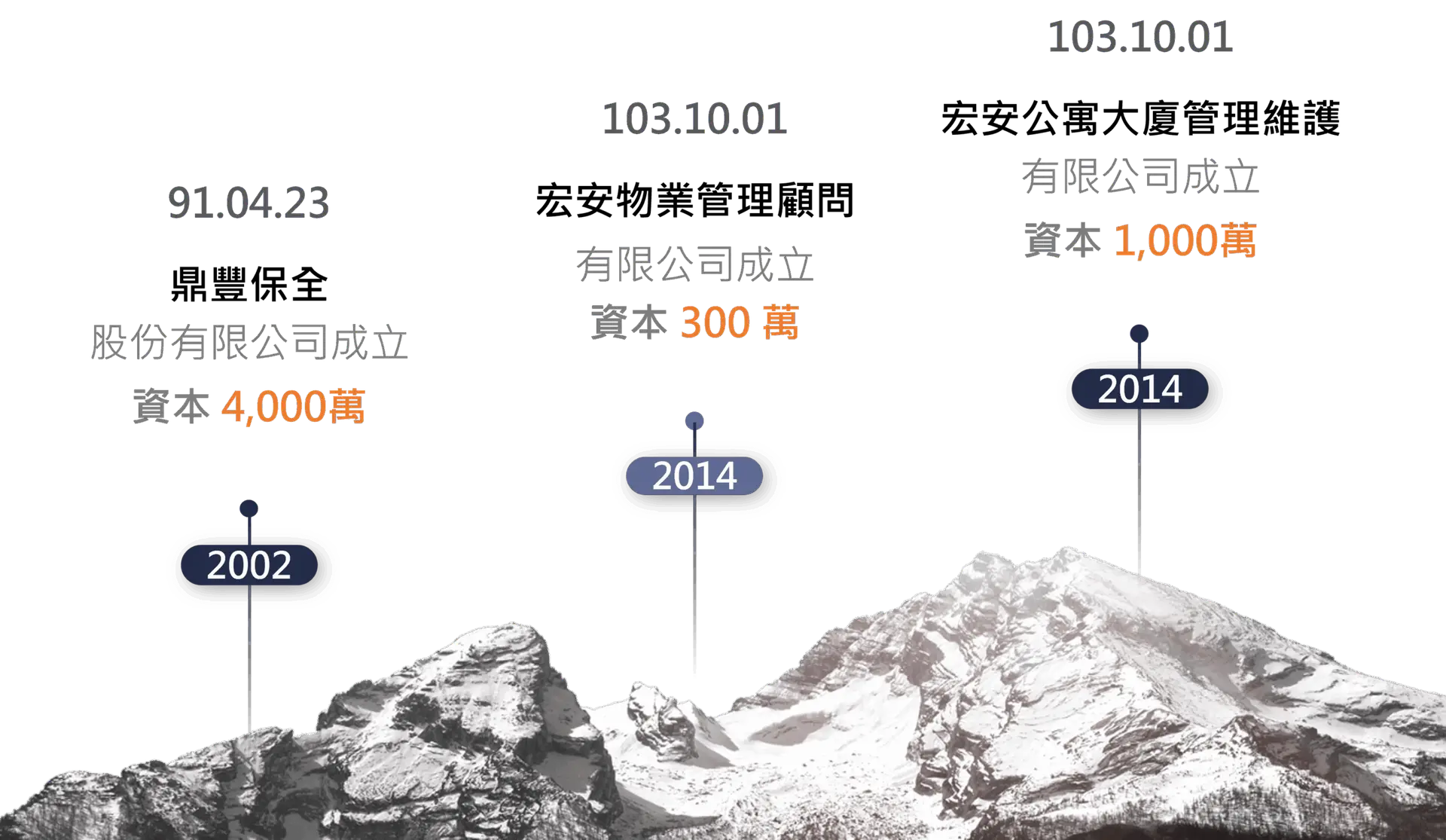 傳承專業,共築安心秉持「誠信、專業、團隊、品質」四大核心價值,成為您永續經營的最佳夥伴 發展沿革集團由鼎豐保全、宏安物業顧問、宏安公寓大廈、麗晶清潔等專業公司組成,提供一站式全方位服務。 2002 年鼎豐保全成立(資本 4,000 萬) 2014 年宏安物業顧問與宏安公寓大廈成立。 我們永續經營的信念 誠信為本深植於心的道德標準,對業主與住戶做出誠實可靠的承諾。 團隊戰力跨公司部門緊密合作,凝聚一致戰力,解決社區複合性問題。 專業服務延攬業界菁英,透過專業分工與系統化作業,提供高品質服務。 品質佳績追求卓越的服務標準,屢獲業主信任與肯定。 選擇鼎豐/宏安,讓您百分百放心! 企業榮譽 ISO認證等相關證照 企業願景成為大中華區最受推崇的物業及保全整合服務標竿企業。 > 我們致力於以卓越的服務品質和創新的管理思維,為每一個託付的社區和企業資產,創造長久穩固的價值與永續安居的環境。 企業使命以「誠信、專業、團隊、品質」為基石,提供全方位整合服務。 我們的使命是結合保全、物業、清潔的專業力量,守護業主資產的絕對安全,並為住戶營造溫馨舒適、具備高度安心感的居家生活。 立即體驗業界最高的服務標準 預約免費諮詢